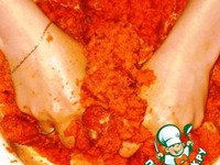 Перемешать и тщательно пожать руками. При этом морковь пускает сок, мясо пускает сок. Все это перемешивается с приправами и когда мясо настаивается, то втягивает в себя уже все соки. |