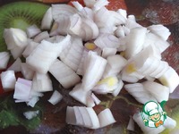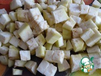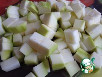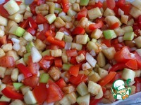 Нарезаем кубиками болгарский перец, помидоры, баклажан, цукини, лук. |