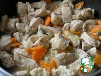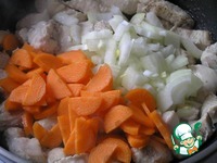 Приготовить паштет. Куриное филе нарезать кусочками, посолить, поперчить, обжарить на растительном масле до побеления. Добавить нарезанный лук и морковь. |