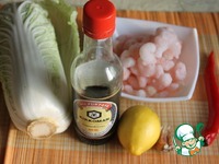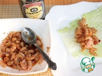 Пекинскую капусту разобрать на листья, отбить молотком грубую часть листа, выложить креветки на листья пекинской капусты |