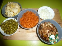 Нарезаем картофель, морковь, огурцы и лук. Сушеные грибы заливаем кипятком, ждем, пока размокнут, и тоже нарезаем |