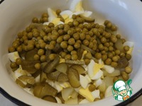 Картофель и яйца отварить и очистить. Нарезать тонкими ломтиками картофель, яйца и маринованные огурцы. В миску выложить картофель. |