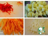 Морковь, сельдерей и чили нарезать соломкой, картофель - маленькими кубиками. |