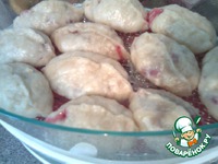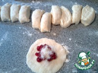 Из теста сделать колбаски, нарезать на кусочки. На расплющенный кусочек (не сильно тонко) положить чайную ложку смородины и чуть сахара. |