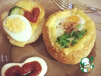 Теперь вбиваем аккуратно яйцо, его сверху немного солим, края булочки выкладываем полосочками сыра.