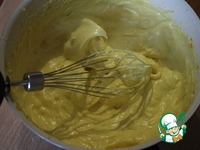 Всыпать 90 г муки и быстро перемешать, чтобы не было комочков. Удобно использовать при этом силиконовую лопатку. Снять с плиты, немного остудить. |