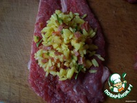 Мясо отбить, посолить, поперчить, положить начинку и свернуть в рулет, перевязать ниткой, обжарить, уложить в форму, залить небольшим количеством сока ананасового и запечь до готовности. |