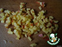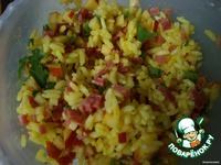Приготовить начинку: рис отварить и подкрасить куркумой, добавить мелко нарезанные колбасу и нектарин, посолить, поперчить. |