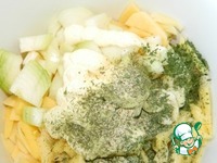 Отдельно смешиваем нарезанный картофель, лук, майонез, специи, укроп, немного соли. |