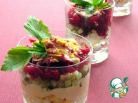 Сверху можно смазать майонезом и посыпать желтком. Охладить в течение 30 минут в холодильнике. При подаче украсить зеленью петрушки. |