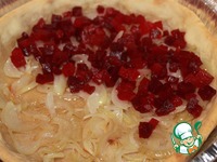 Вынуть форму из духовки, выложить на тесто обжаренный лук, свёклу. |