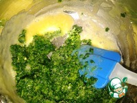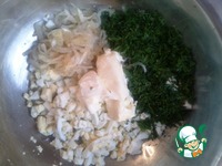 Для начинки обжариваем лук, крошим варёные яйца, зелень, соль, добавляем 50 граммов масла (можно майонез). |