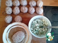 На кусочке пергамента разминаем колобок фарша в блинчик, выкладываем начинку и с помощью пергамента соединяем края. Я брала 70 г фарша и 20 г начинки. |