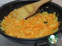 Бросаем лук, обжариваем минуты 2 и добавляем морковь, даём притомиться минуты 3, а пока лук с морковкой жарятся... |