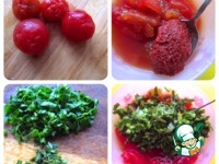 Томаты в собственном соку размять вместе с соком и томатной пастой. Зелень вымыть, обсушить, покрошить произвольно, смешать с томатной заготовкой. |