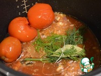 Добавить томаты в собственном соку, связанные веточки укропа и лавровые листики, посолить, поперчить. Готовить 10 мин. при режиме Тушение. |