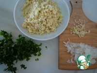Булгур залить горячей водой в соотношении 1 к 2, поставить в теплое место для набухания на 15-20 минут. Лук, чеснок и петрушку мелко нарезать. |