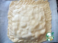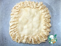 Сверху накрыть вторым раскатанным пластом. У меня получилось немного кривовато. Края пирога разрезать на полоски |