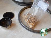 По истечении 3-4-х дней мясо хорошо промываем в холодной воде и приступаем к копчению. Нужно не забыть на крышке скороварки поменять белое кольцо на кольцо для копчения. |