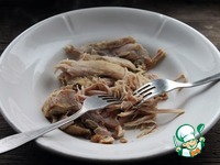 Мясо очень легко распадается на волокна, именно эта структура и нужна. В данном рецепте мне нравится оставлять длинненькие волокна мяса. |