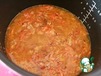 К овощам с фаршем добавляем пару мультистаканов воды или бульона. |