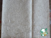 Режем лаваш на 5 равных прямоугольников. Выкладываем немного начинки на одну сторону и заворачиваем в рулет. |