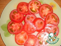 Моцареллу порежьте кусочками подходящего размера, и уложите сверху на помидорки. |