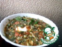 При подаче: выкладываем в глубокую тарелку заправку, заливаем холодным квасом и посыпаем зеленью. Добавляем в каждую тарелку ложку сметаны и......... Приятного аппетита.