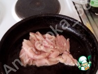 Наливаем на сковороду оливковое масло, немного прогреваем его и выкладываем курицу. |