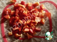 Теперь нарезаем перец кубиками. Выкладываем его на сковороду с оставшимся маслом со специями, обжариваем на среднем огне. |