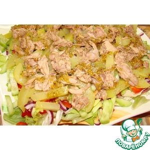 Описание: Салат с тунцом, очень интересное и вкусное блюдо. Готовить его просто и достаточно быстро. Ингредиенты отлично сочетаются между собой, а свежие овощи дополняют вкусовые качества салата. Салату нужно время для пропитки. Непосредственно перед употреблением перемешиваем. Может внешний вид кому то не очень нравится, то скажу, что он достаточно красиво смотрится на столе. Мы привыкли слои смазывать майонезом, а здесь вся красота наружу. Приятного аппетита!
