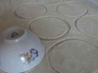 6)Раскатываем тесто толщиной 0,5 см. вырезаем на нём круги пиалой диаметром 11см. Всего должно, получится 16 тюльпинчиков. |