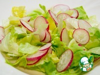 На тарелку выложить крупные хлопья салата, на него — редис. |
