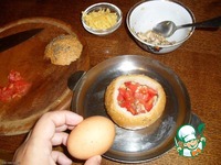 Помидор промыть и нарезать кубиком. У булочки срезать верхушку и вынуть мякоть. На дно выложить курицу с грибами, затем помидор и сверху яйцо. |