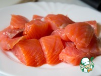 Пока тесто отдыхает: брокколи бланшировать (на 5 минут залить кипятком), сырую семгу нарезать крупным кубиком. |