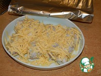 Выложить в форму, смазанную маслом. Посыпать тертым сыром. Прикрыть фольгой и поставить в духовку при 200*С на 30 минут, затем фольгу снять и еще минут 10-15 для подрумянивания. |