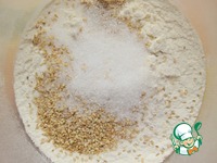 Смешать сухие ингредиенты: просеянную муку, кунжут, разрыхлитель, сахар, соль, имбирь, паприку и орегано. |