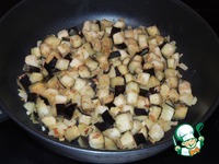 Лук пассеровать на оливковом масле до прозрачности, добавить чеснок, прогреть. Соединить с баклажанами и обжаривать до их готовности 7-10 минут. |
