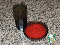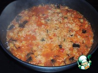 Отмерить готовый овощной бульон и томаты. В сезон вместо баночных можно использовать свежие помидоры, очищенные от кожицы, которые следует обжарить вместе с баклажанами. |