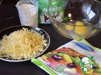 Все ингредиенты (кроме овощной смеси) смешать в миске, посолить. |
