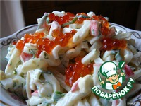 И в оригинале 1 банка красной икры... ну здесь как кому хочется ... и кто сколько может себе позволить! Порезать соломкой, заправить майонезом и подать! Салат очень нежный, очень вкусный!!!