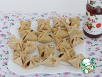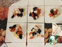Тесто тонко раскатать. Толщина мм 1 мм. Разрезать на квадраты 4 см х 4 см. Выложить на каждый квадрат по чайной ложке начинки |