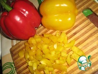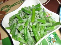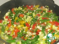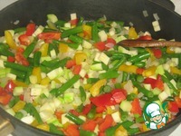 Взять глубокую жаровню- хорошенько разогреть 2 ст. л. масла и выложить на пассировку лук. Немного обжарив, в нее отправить перец, кабачок, стручковую фасоль. Обжарить, при постоянном помешивании. |