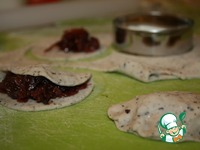 Тонко раскатать, вырезать кружки, положить начинку, скрепить края - быстро и приятно) |
