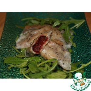 Для сервировкм на подушку из рукколы выложить вареники и полить соевым соусом! |