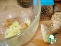 Приготовим маринад. Корень имбиря натрем на мелкой терке, добавим коричневый сахар. |