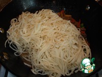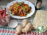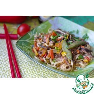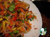 У меня была смесь овощей: морковь, ростки фасоли мунг, перец, зеленый горошек, лук-порей, китайские грибы, молодой зеленый горошек (стручки). |