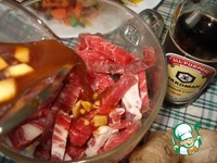 Говядину, нарезанную тонкими брусочками, зальем маринадом и оставим мариноваться минут 30. |