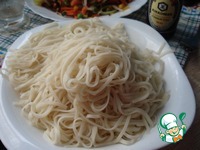 Яичную лапшу отварим согласно инструкции на упаковки. Я после варки промывала лапшу холодной водой. |