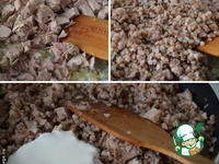 К луку добавить уже охлажденные мясо и гречневую кашу, перемешать. Добавляем сливки, перемешиваем. Через несколько минут добавить мелко рубленную зелень, перемешать и выключить огонь. |